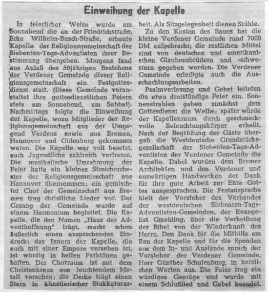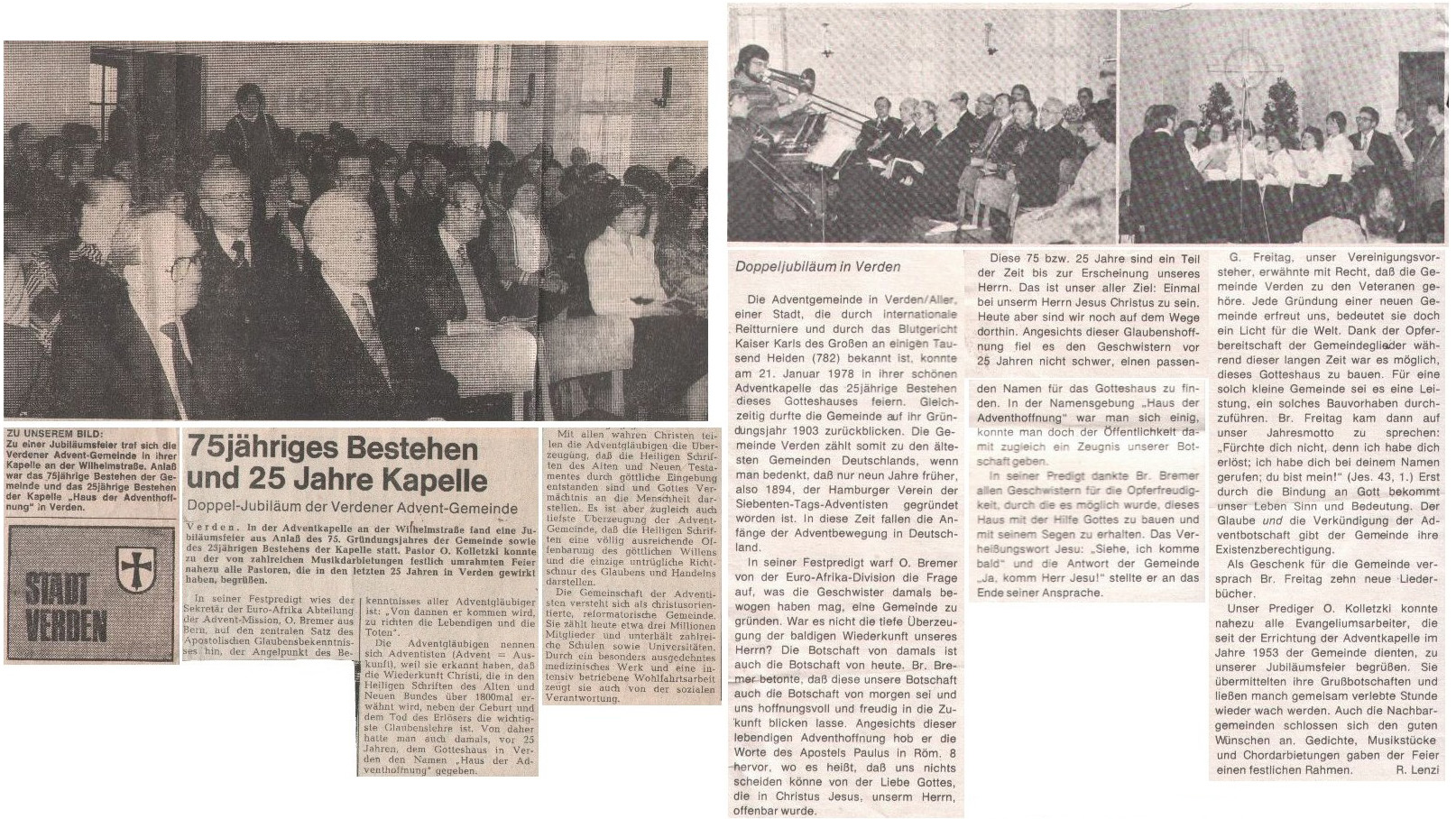 75. Gründungsjahres der Gemeinde sowie des 25jährigen Bestehens der Kapelle. So konnten anläßlich dieses Doppeljubiläums am 21. Januar 1978 mit dem damaligen Pastor O. Kolletzki auch nahezu alle Pastoren die in den letzten 25 Jahren gewirkt hatten an der Feierstunde teilnehmen. Auch hierzu sind noch Zeitungsartikel verfügbar.